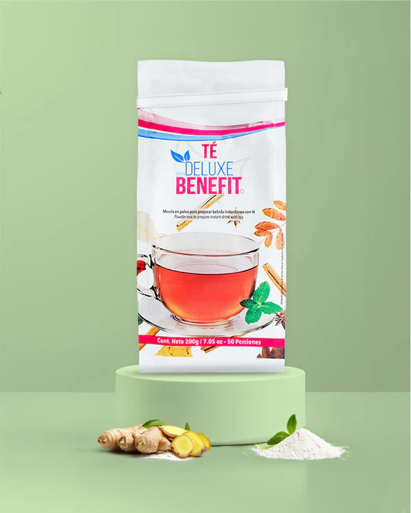 MODO USO TÉ DELUXE BENEFIT En una Taza de agua caliente agregar 1 cucharada de té. Revuelve y tómalo dos veces al día media hora después de las comidas, evita el consumo de lácteos para mayor efecto.